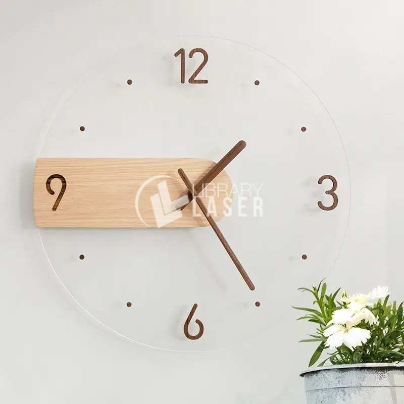 Archivo para corte láser de reloj decorativo para el hogar de madera y acrílico transparente, ideal para proyectos en madera o acrílico.